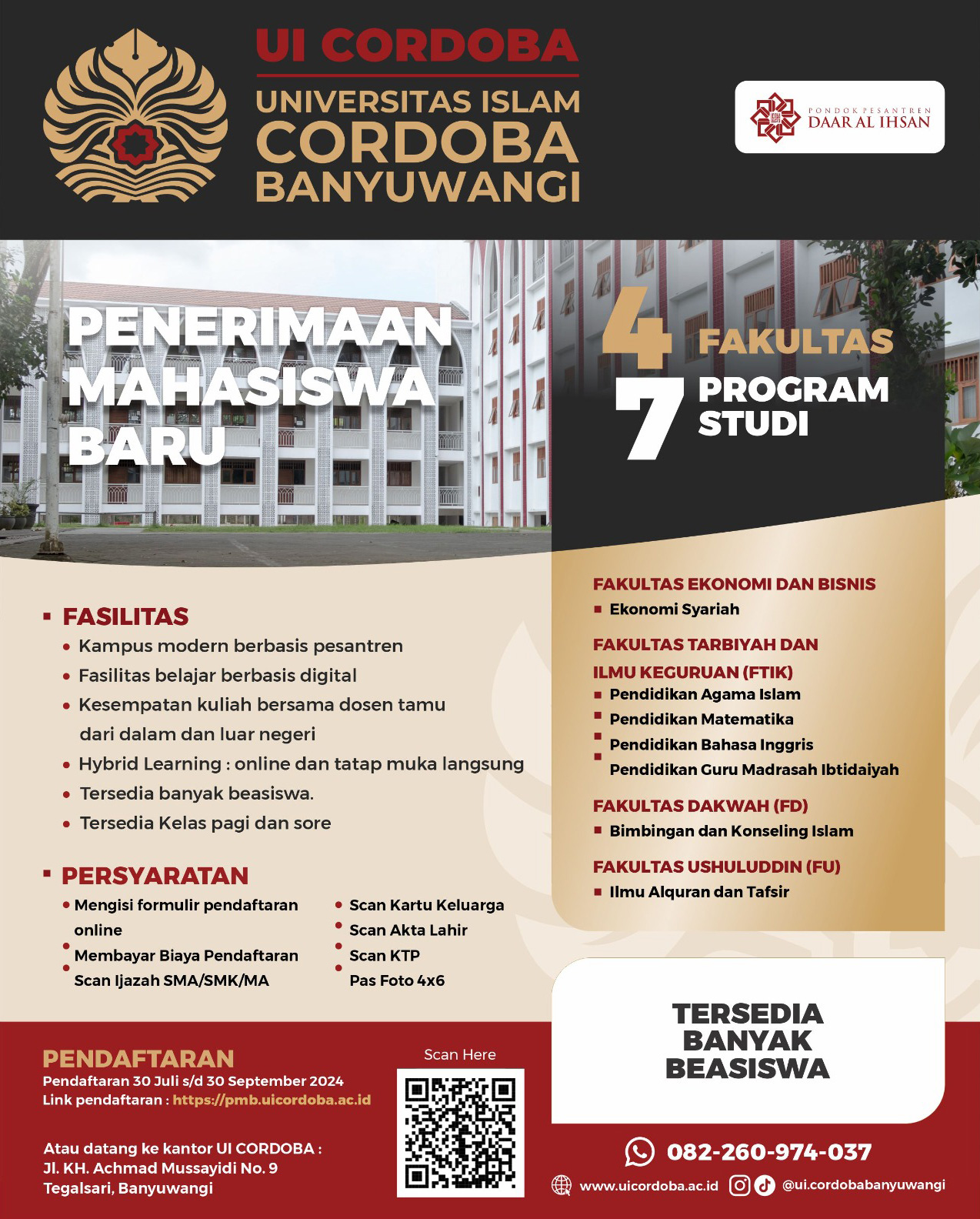 UI Cordoba Banyuwangi menawarkan berbagai program studi dengan kualitas pendidikan yang tinggi. Kami juga menyediakan sejumlah beasiswa untuk membantu meringankan biaya pendidikan Anda. Untuk informasi lebih lanjut atau pertanyaan terkait pendaftaran, jangan ragu untuk menghubungi kami. Tim kami siap membantu Anda dalam setiap langkah proses pendaftaran.